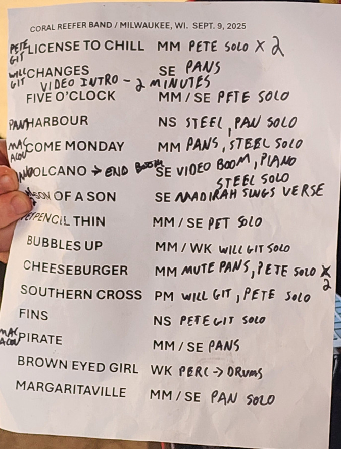 Even after Buffett’s passing in September 2023, the Coral Reefer Band chose to continue performing his music, honoring his request to “keep the party going.” They reunited publicly in April 2024 for a tribute concert at the Hollywood Bowl and later played a full set at the New Orleans Jazz Fest. They played a full set tonight, as well, and fans loved it. My setlists are below.
