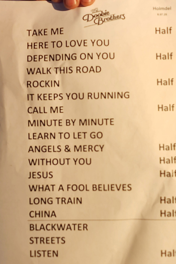 Normally, I’d write about the highlight of the show, but the entire show was a highlight, with just a two minute technical glitch between song 1 and song 2. The Doobie Brothers aren’t just surviving, they’re thriving. Their sound remains fresh, their energy contagious, as classic rock remains timeless. With a lineup that blends original members and seasoned musicians, they continue to deliver unforgettable shows. Tonight in Noblesville was no exception. My setlists, below: