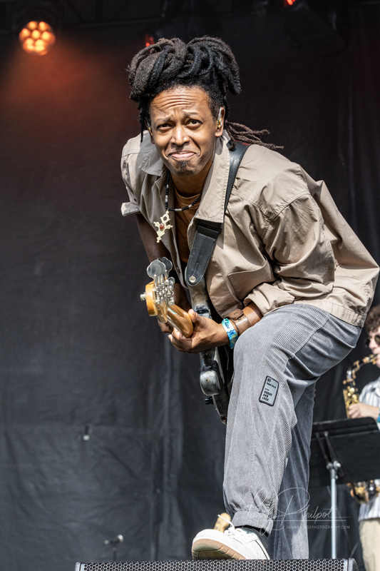 Midway, magic happens: Cory invites Remi Wolf out to sing “Tell Me Something Good,” her voice a velvet fire that ignites the field. The Rufus cover pulses alive, Remi’s charisma pulling everyone in, and then—the highlight—an awesome bari sax solo unfurls, low and rumbling like thunder over the water, notes bending with raw power. The crowd loses it, hands up, bodies grooving as one, the collaboration seamless, electric. They roll into “Team Sports” next, a high-octane jam that has parents hoisting kids, groups linking arms, the positive vibes radiating. “Bluebird” follows, lighter but no less driving, Cory trading licks with the horns in playful call-and-response.
