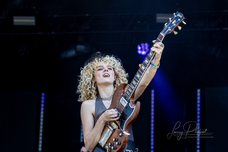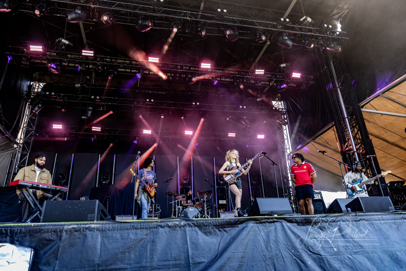The band kicks off, and right away, it’s got this jazzy cover-band vibe—those five sharp Black male instrumentalists laying down tight grooves that echo classic R&B joints, horns teasing the edges if they’re there, bass thumping like a heartbeat. Then Grace emerges, this young white firecracker of a singer-guitarist, all of 19, slinging her axe with a confidence that belies her years. She’s decent on the mic, her voice carrying that husky edge perfect for soulful bends, but oh man, the guitar work? Talented doesn’t cover it—she rips solos that dance between bluesy wails and funky licks, fingers flying like they’ve got stories of their own. The Hodge Podge backs her seamlessly, a tight unit that’s played a little of everything today: funk romps, rock-infused struts, soulful sways that pull you in and don’t let go. It’s that mix that hooks you, keeping the set fresh, never predictable, a patchwork of sounds that mirrors the festival’s eclectic spirit.