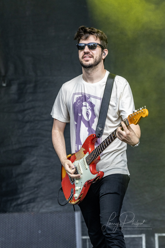 They kick off with “Attractive Today,” and out bounds Patrick Stump of Fall Out Boy for the first three songs, his voice a seamless blend of falsetto fire and familiar punch. “Perfect Teeth” snaps next, the synths swirling like old friends, then “My Favorite Accident,” Cain’s riffs cutting sharp. Patrick’s energy is infectious, prowling the stage, drawing cheers that echo off the river. But it’s the fourth and fifth where the local love shines: BER, the Minnesota powerhouse, takes the mic for “Last Night” and “A Lifeless Ordinary (Need a Little Help).” Her raw edge fits like a glove, and midway, she rallies the audience in a thunderous scream: “Feel better, Justin!” The field erupts, fists pumping, a collective well-wish that feels like medicine carried on the breeze.