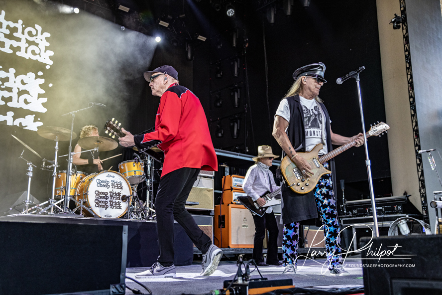 The crowd filled the amphitheater quickly. Families, couples, and groups of friends settled in. Many wore vintage tour shirts. Others sported sequined outfits, nodding to Rod’s flashy style. Rock Hall of Famers Cheap Trick got the crowd going, playing a very energetic full set until the sun faded.